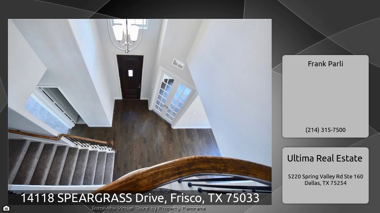 The Virtual Tour for the property at 14118 SPEARGRASS Drive, Frisco, TX 75033 listed for $479,000: Other homes for sale by Frank Parli of Ultima Real Estate: $50K PRICE DROP!! ABSOLUTE BEST VALUE IN FRISCO!! BRAND NEW IN GRAYHAWK! 3 CAR GARAGE! FACES WEST. Beautiful Country French design with stone accents and buff mortar. Elegant front door leads to 2 story foyer. HARDWOOD FLOOR ENTRY, FAMILY, STUDY, and F. DINING! Large kitchen with custom cabinetry. Study with French Doors, Large F. Dining, Huge Master Down, Guest BR down. 10' PLATE 8' DOORS FIRST FLOOR. Large 2-story Family Room. 3 …