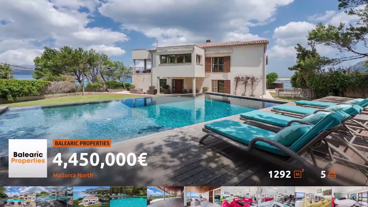 This front line villa is in a highly sought after residential area in the north. It is literally a few steps away from the turquoise waters of the Pollensa bay. There are absolutely stunning views towards the bay of Formentor, and an enchanting sandy beach, just 50m down the pedestrian lane. The property offers impressive sea views from all living areas and bedrooms. The enormous living room on the first floor has several sets of French doors leading onto the huge terraces, from which you can take in the whole bay of Pollença. On that same first floor you also find a state-of-the-art kitchen with dining area and a study with cloak room to use as a guest suite or library/office. On the ground floor you find 4 double en-suites, all exiting to the outside areas, and a catering corner with fridges/sink and cloakroom for the pool area. The pool is behind the house and raised up a little so sea views are enjoyed from the sunbathing area. And last but not least, there is a garage/studio apartment with bathroom. An exceptional property like this seldom comes up for sale. Book a viewing now!