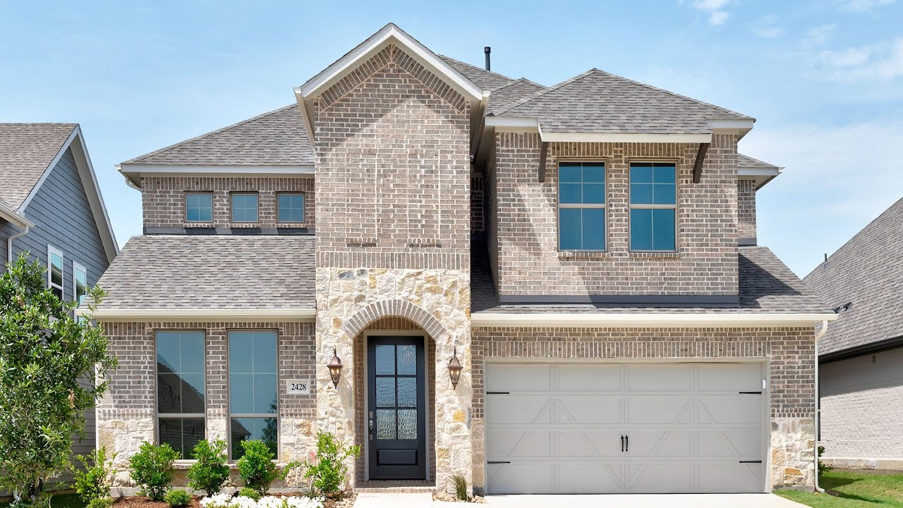 Pecan Square will be reminiscent of a classic Texas town full of life, town spirit and new ways to live. This 2999 sq. ft. ready for move-in home has four bedrooms, three full bathrooms and one half bathroom. Library with French doors set at two-story entry. Open kitchen features quartz countertops, corner walk-in pantry and inviting island with built-in seating space. Two-story dining area flows into two-story family room with four large windows and wood mantel fireplace. Ceramic tile floors throughout. Private master suite offers double-door entry to master bath with dual vanities, garden tub, separate glass-enclosed shower and walk-in closet. First-floor guest suite includes full bath. The second floor features a game room, media room with French doors and two secondary bedrooms. Walk-in closets in all bedrooms. Covered backyard patio. Mud room leads to three-car garage. #perryhomes #perryhomesdallas #pecansquare