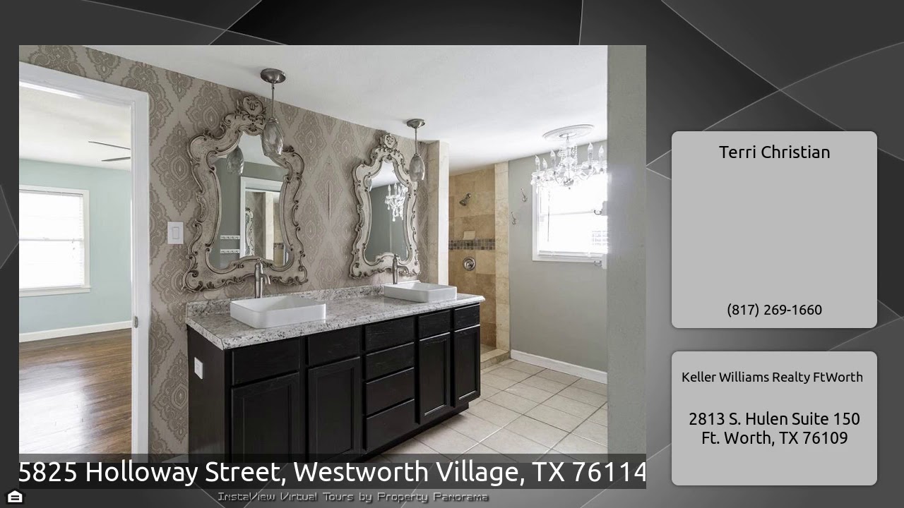 The Virtual Tour for the property at 5825 Holloway Street, Westworth Village, TX 76114 listed for $195,000: Other homes for sale by Terri Christian of Keller Williams Realty FtWorth: Vacant and ready for new owner! Living area and dining area with wood floors. Open kitchen to spacious secondary living room. Kitchen features tile floors, stainless steel oven. dishwasher, refrigerator, Second living area with french doors to the outdoor, bar and plank flooring. Master bath has updated shower, two sinks and a wall of storage. Bedrooms 2 and 3 have an adjacent bath. Fenced, large storage …