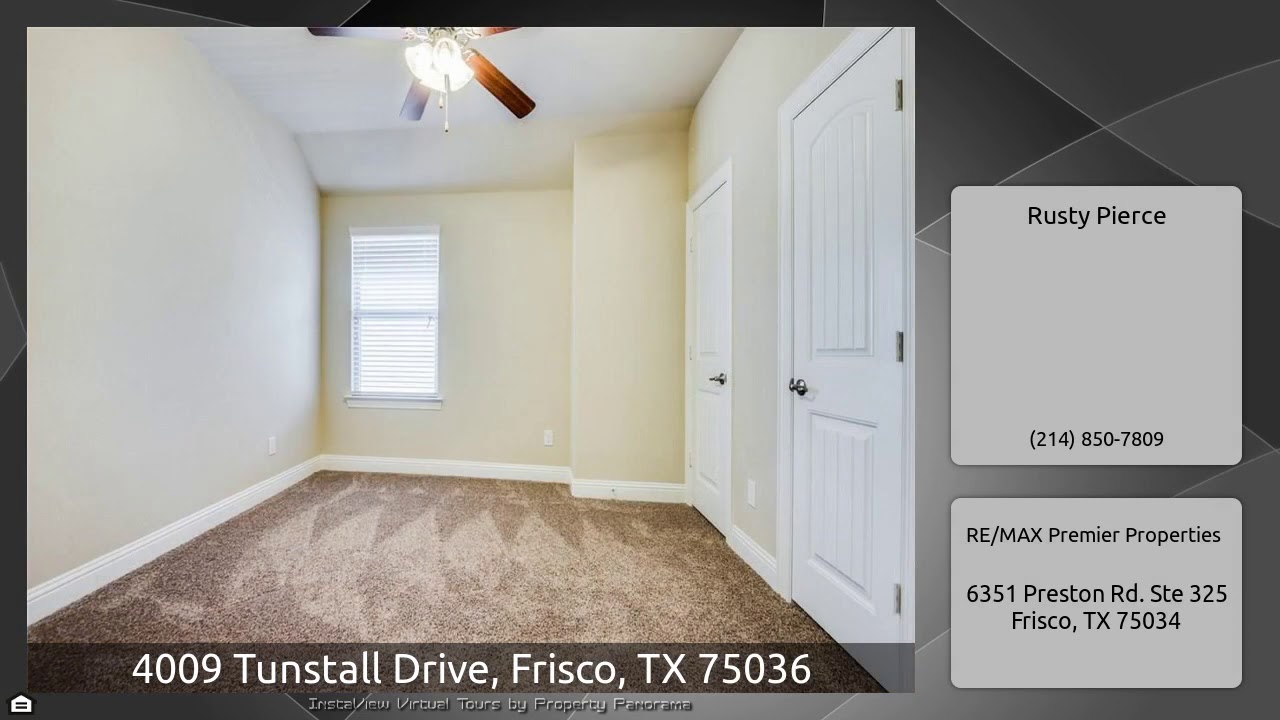 The Virtual Tour for the property at 4009 Tunstall Drive, Frisco, TX 75036 listed for $305,000: Other homes for sale by Rusty Pierce of RE/MAX Premier Properties: Welcome to this like new, DR Horton home, Condor floor-plan with beautiful rock & brick elevation & 8 ft. front door. Inviting grand entry with arched doorways and niches, study with french doors, blinds and ceiling fans throughout. Expansive living, dining and kitchen with California bar, granite counter-tops, subway back splash, abundance of cabinets, stainless appliances, gas cook-top and walk-in pantry. Spacious master suite …