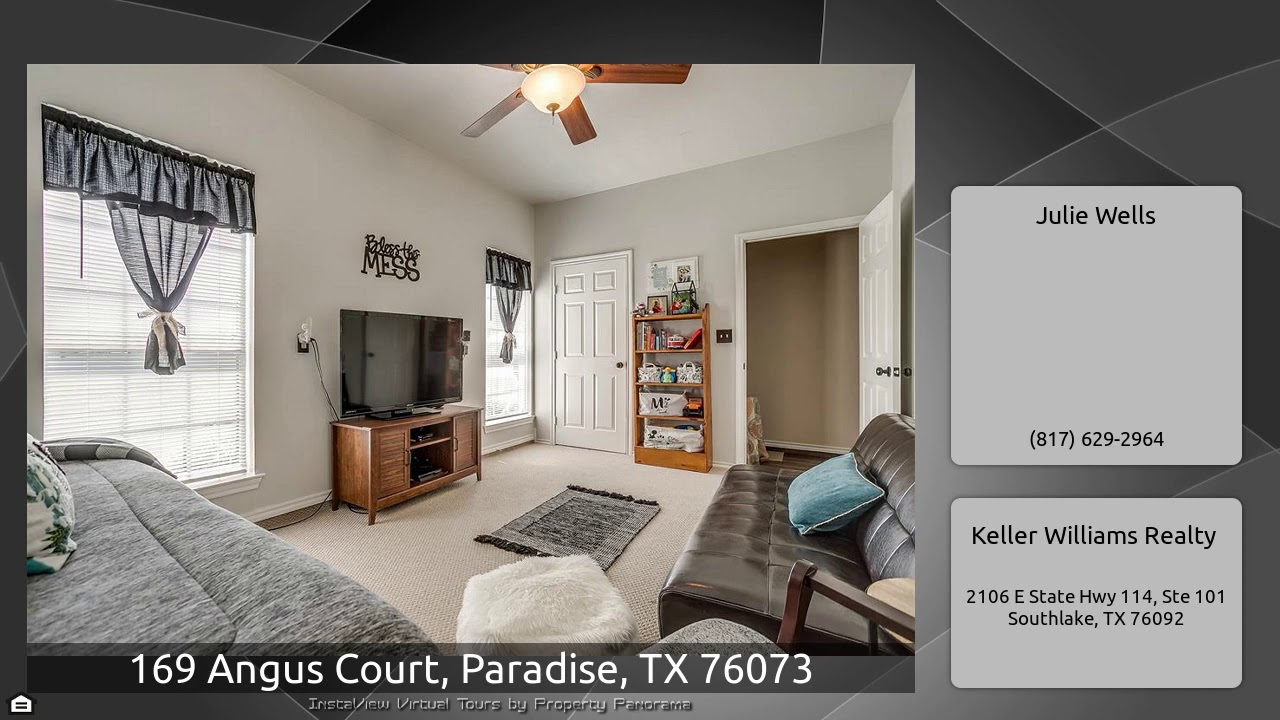 The Virtual Tour for the property at 169 Angus Court, Paradise, TX 76073 listed for $415,000: Other homes for sale by Julie Wells of Keller Williams Realty: Updated 3 bedroom 2 bath w flex room for additional bedroom, office, media or study. Split and open concept w large kitchen w new ss appliances, granite, large pantry, bar seating for 6 stools & room for lg dining table. Roomy living area w fireplace, French doors to outdoor lv space w expanded concrete patio area. Master suite w vaulted ceiling, dual sinks, built ins, soaking tub, tiled shower & separate closets. Comfortable guest rms …