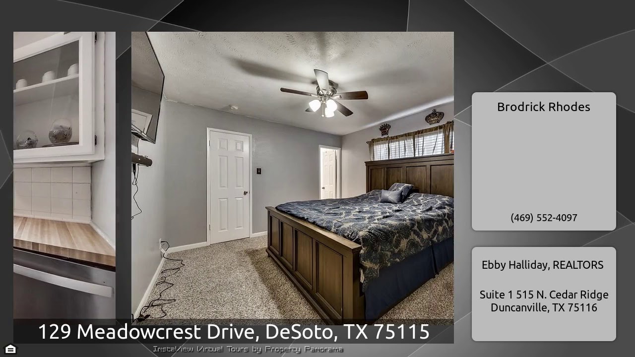 The Virtual Tour for the property at 129 Meadowcrest Drive, DeSoto, TX 75115 listed for $180,000: Other homes for sale by Brodrick Rhodes of Ebby Halliday, REALTORS: This well maintained one story home is located an established community in sought after DeSoto. As you walk into the foyer you're greeted by the dark wood style vinyl floors and a nice sized dining room and kitchen. Take a few steps into the oversized living room with french doors that lead to the covered patio. It's the perfect place to Netflix and chill by the fire place during a cold winter night. The two bedrooms and …