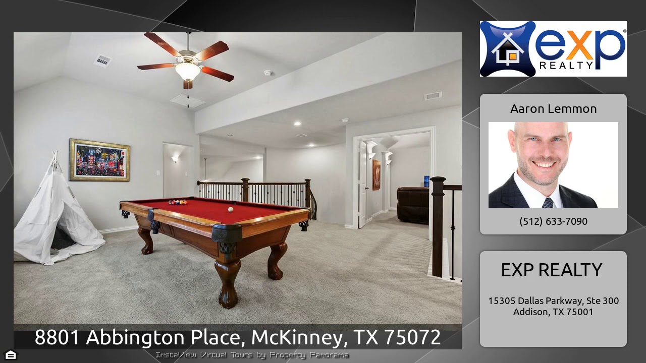 The Virtual Tour for the property at 8801 Abbington Place, McKinney, TX 75072 listed for $490,000: Other homes for sale by Aaron Lemmon of EXP REALTY: Beautifully updated home in Stonebridge Ranch. Wood floors downstairs. First level features an En Suite bedroom with attached bathroom and walk in closet. Home office has french doors and wood floors. A formal dining space is next to a dream kitchen. The kitchen is truly a great place to be with gas range, large granite island, walkin pantry and a lot of cabinets. The master bedroom is large and has a lot of natural light with a wall of …