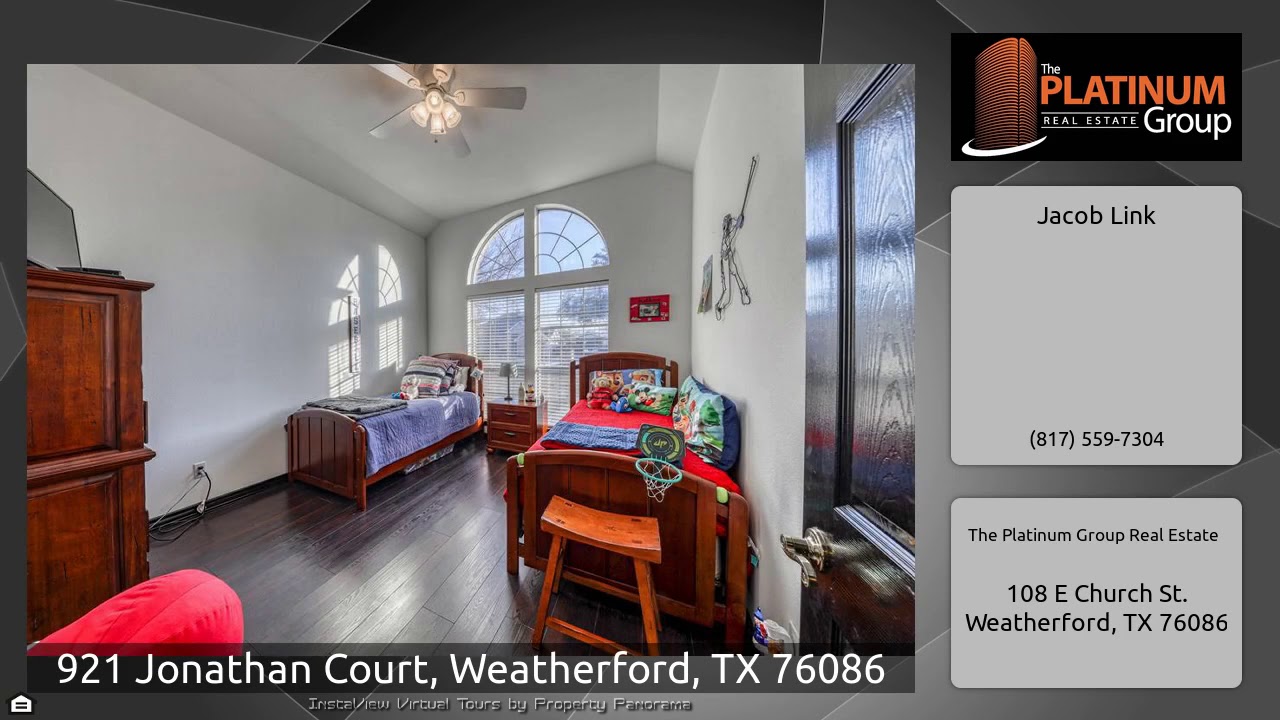 The Virtual Tour for the property at 921 Jonathan Court, Weatherford, TX 76086 listed for $289,000: Other homes for sale by Jacob Link of The Platinum Group Real Estate: Beautiful home in a beautiful neighborhood! Extremely good location. This 3 bedroom 2 bath home located just a few blocks form I 20. Great neighborhood! Large kitchen, spacious living, surround sound, gas fireplace. Hardwoods, vaulted ceilings, formal dining with French doors (or your office). Huge Master Suite with 2 walk-in closets and sitting area, private access to outdoor living. Private back yard, large covered patio, …
