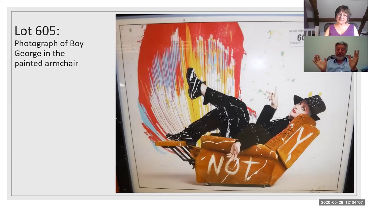 Pre-auction review of: Boy George artwork armchair, Fender guitar signed by Barry Gibb, Queen photo montage with band signatures, signed photos of Charlie and Sydney Chaplin and French farmhouse table. Items discussed by Philip Allwood of Moore Allen Auctions and Lesley Jewell of The Arts Society Corinium.