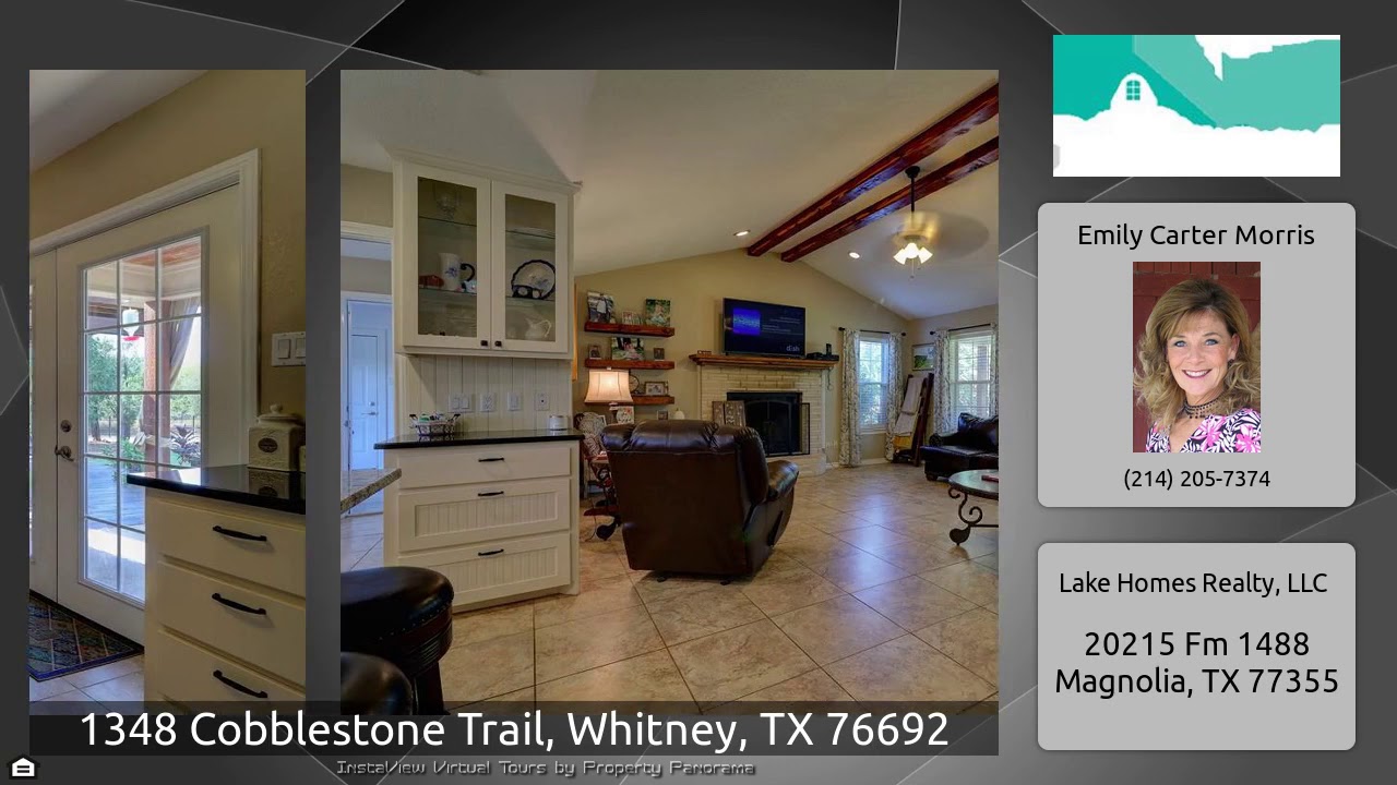 The Virtual Tour for the property at 1348 Cobblestone Trail, Whitney, TX 76692 listed for $285,000: Other homes for sale by Emily Carter Morris of Lake Homes Realty, LLC: Amazing find in White Bluff Resort. Come enjoy the openness of this home with vaulted ceilings, canned lighting, ceramic tile and hard wood floors. Great for entertaining or just relaxing. Master is charming with an on suite. Claw foot tub and huge walk in shower. Sinks are stylish yet simple. Kitchen has a large island, farm house sink, granite counters and lighter cabinets. French doors off the dining room lead to to an …
