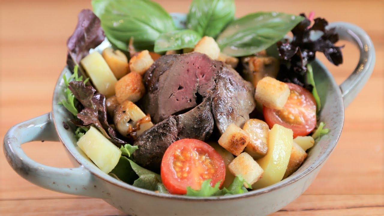 This recipe consist of a mix of a green leaves salad served with tomatoes, mushrooms, potatoes and croutons. the whole lot is then topped with pan fried chicken livers cooked in garlic and deglazed with Raspberry vinegar. The salad is then dressed with a Raspberry vinegar dressing.