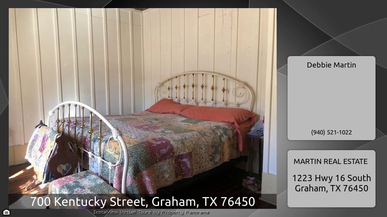 The Virtual Tour for the property at 700 Kentucky Street, Graham, TX 76450 listed for $125,000: Other homes for sale by Debbie Martin of MARTIN REAL ESTATE: 3 BR Victorian style home-Corner lot consisting of 2 lots (100 x 180 YCAD)-1.75 baths-CH & Air(2 units) – Original wood floors throughout entire first level-Laminate flooring on second level-Stamped tin ceiling in living room – Spacious kitchen with farm sink,dishwasher & refrigerator – Also French door exiting kitchen to side yard – Wide wood plank walls in dining area – Hall bath features claw foot tub with shower-Upstairs bath has a …