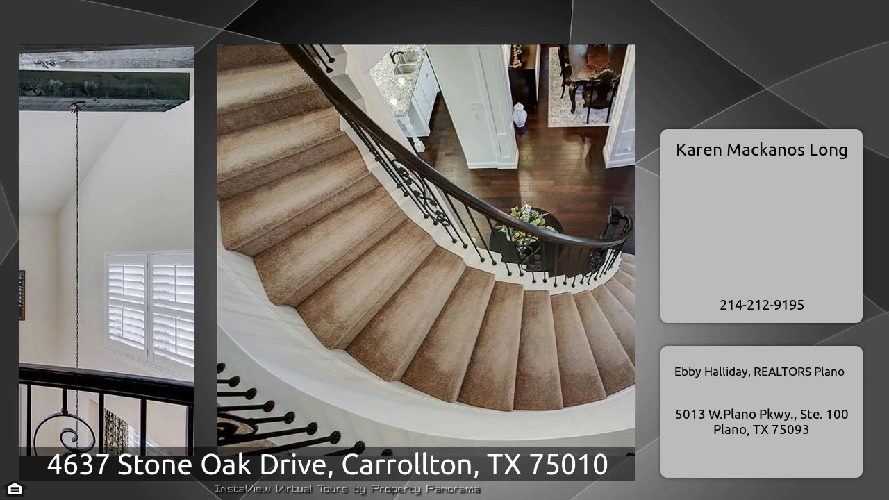 The Virtual Tour for the property at 4637 Stone Oak Drive, Carrollton, TX 75010 listed for $565,000: Other homes for sale by Karen Mackanos Long of Ebby Halliday, REALTORS Plano: Exquisite home in pristine condition. Fully upgraded with beautiful Wd flooring, granites, marbles, millwork, lighting, custom wrought iron stairs, extended back patio.Oversized Study boasts 2 sets of French doors. Fml Dining is accented w upgraded chandelier & wall sconces. Kitch has over sized island that allows up to 5 barstools,above & below cabinet lighting,pull out spice racks,glass cabinet doors,WI pantry,5 …