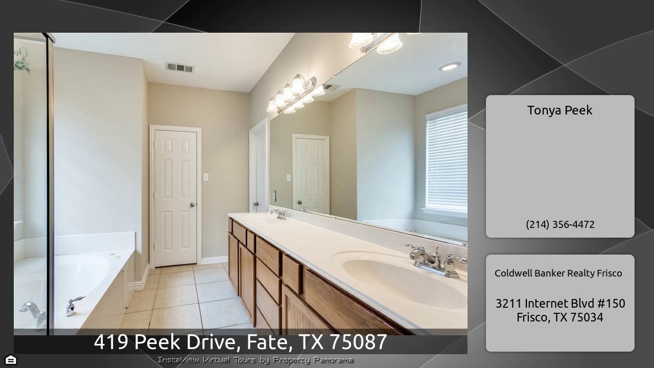 The Virtual Tour for the property at 419 Peek Drive, Fate, TX 75087 listed for $325,000: Other homes for sale by Tonya Peek of Coldwell Banker Realty Frisco: Want room for all the family to work & play in? Then this is the home. Absolutely perfect 2-Story Home in Woodcreek! Fresh paint and carpet. Entry with High Ceilings, Ceramic Tile, Elegant Formal Living Area with French Doors, Formal Dining Room.Kitchen is equipped with plenty of storage & granite countertops. Huge Master Bedroom Suite Down + Study. 4 large Bedrooms up, plus Game Room and Media Room! Beautiful Family Room with Brick …
