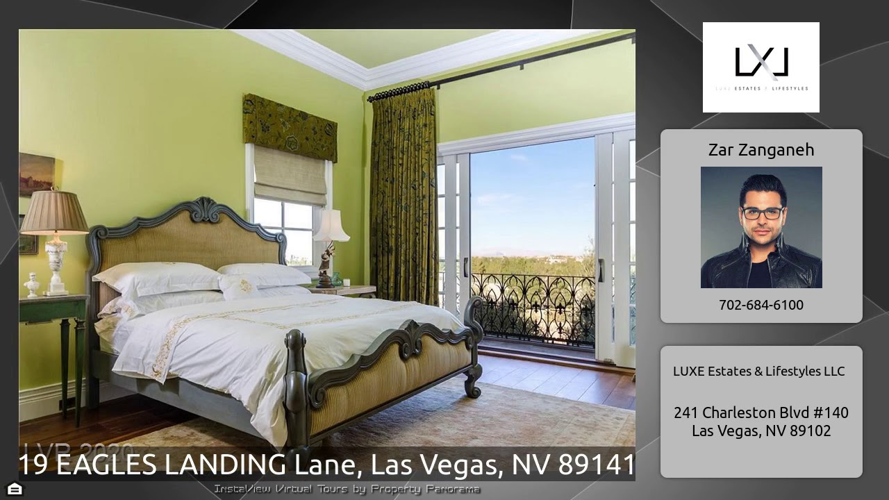 The Virtual Tour for the property at 19 EAGLES LANDING Lane, Las Vegas, NV 89141 listed for $7,400,000: Other homes for sale by Zar Zanganeh of LUXE Estates & Lifestyles LLC: Enter the grand foyer leading into the elegant formal living room w/fireplace & walls of French doors welcoming light & covered patios. Main level include formal dining, wood-paneled library, family room, onyx bar, spacious kitchen w/center island, professional appliances, and lovely breakfast room with French doors opening to outdoor dining deck & delightful garden. The backyard offers a tranquil resort-style setting …