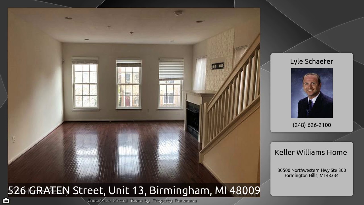 The Virtual Tour for the property at 526 GRATEN Street, Unit 13, Birmingham, MI 48009 listed for $2,750: Other homes for sale by Lyle Schaefer of Keller Williams Home: 2 bedroom 2 bath end unit with side windows that add much natural light. features include: Library with French doors, Living room, Kitchen and dining room have hardwood floors. Dining room has door wall to balcony. Living room with fireplace. Master bedroom with walk in closet and full bath. Highest level is family room/ great room has 1/2 bath and loads of potential. Two car attached tandem garage