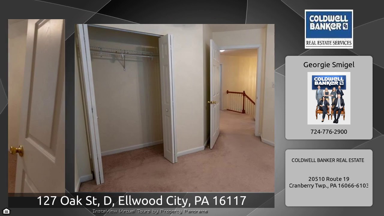 The Virtual Tour for the property at 127 Oak St, D, Ellwood City, PA 16117 listed for $179,000: Other homes for sale by Georgie Smigel of COLDWELL BANKER REAL ESTATE: Move-in ready townhome style condo. Care free living. Ext. maintenance included. Snow removal to front door, grass cutting, trash, 20 min from Cranberry-Riverside schools. Covered entry to brick-face 2 story. Spacious living room w/neutral carpet. Dining room is so spacious it was used as family room w/hardwood. CI kitchen w/hardwood floor, new glass top stove, b-fast bar & 12×11 morning room w/French door to deck. 1st flr laundry …
