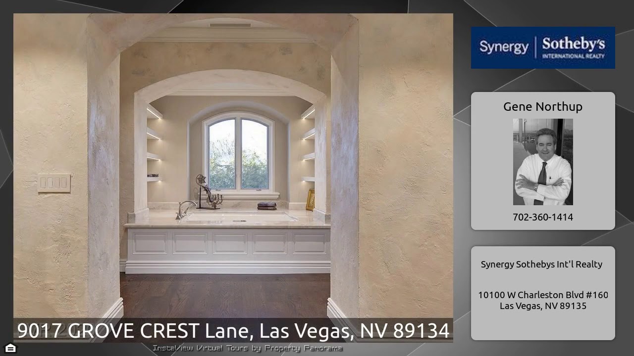 The Virtual Tour for the property at 9017 GROVE CREST Lane, Las Vegas, NV 89134 listed for $3,800,000: Other homes for sale by Gene Northup of Synergy Sothebys Int'l Realty: Built & Remodeled by Merlin! Mediterranian-style with classic columns, French doors to terrace w/stone walkways, palm trees, and heated pool, jacuzzi. Marble-toned walls, high ceilings, recessed lighting, chandeliers. Chef’s kitchen, state-of-the-art appliances, center island, formal dining room. Elegant marble dining table. Master suite balcony w/golf & sunset views, fireplace, adjoining office. Master bath with separate …