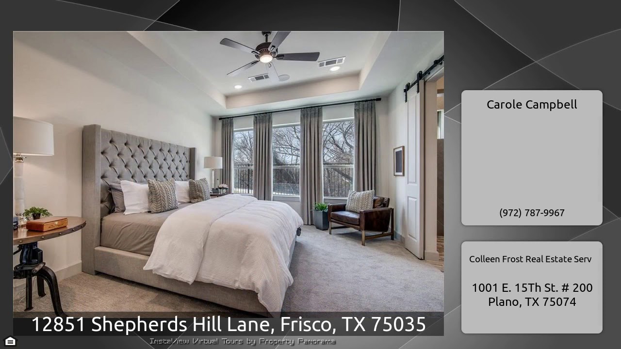 The Virtual Tour for the property at 12851 Shepherds Hill Lane, Frisco, TX 75035 listed for $376,290: Other homes for sale by Carole Campbell of Colleen Frost Real Estate Serv: NORMANDY HOMES CHELSEA floor plan. Fantastic curb appeal & french country charm welcomes you home. The foyer leads to enormous family retreat with oversized windows for lots of natural light! The open family & dining areas lead into the gourmet chefs kitchen featuring stainless steel appliances + large island. Owner's retreat is private & comfortable, featuring walk-in closet with natural light pouring in. The master …