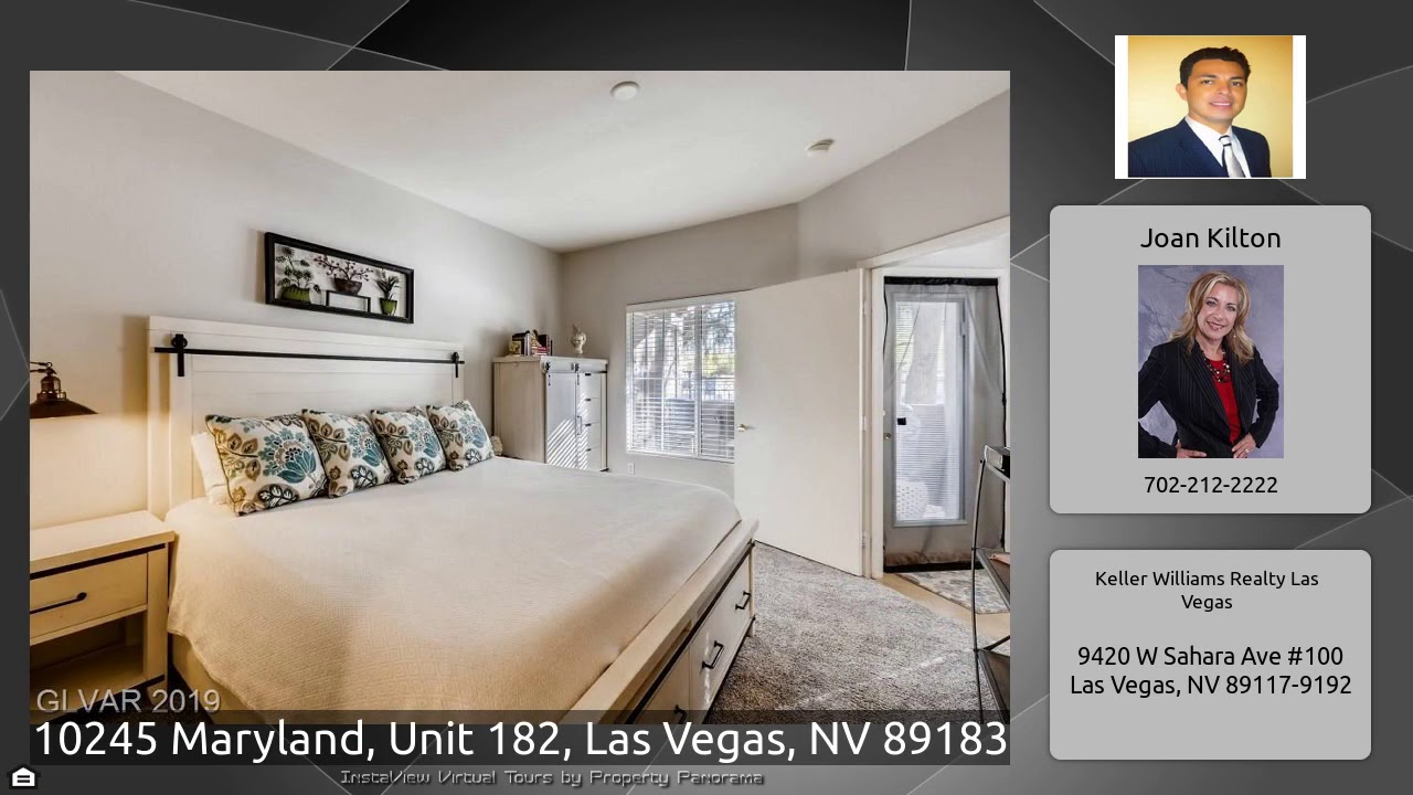 The Virtual Tour for the property at 10245 Maryland, Unit 182, Las Vegas, NV 89183 listed for $178,000: Other homes for sale by Joan Kilton of Keller Williams Realty Las Vegas: This beautifully upgraded unit is move-in ready.New paint,New Carpet in the bedrooms,New tile in the living room,dining room,kitchen & bathrooms.New white faux wood blinds throughout.New window insert w/blinds in french door to the patio.New side by side white Whirlpool refrigerator.New white gas stove.Bedrooms are on opposite sides of the home for privacy.Three people can work in the kitchen comfortably & the high bar …