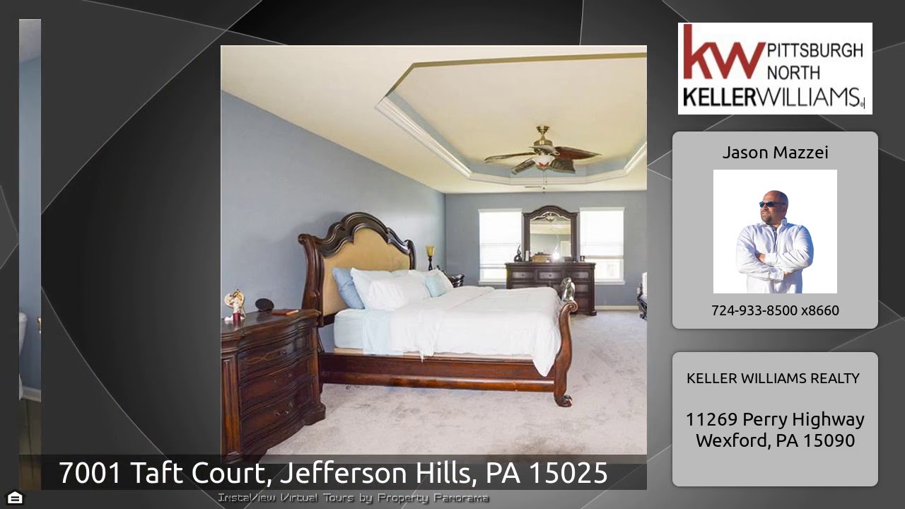 The Virtual Tour for the property at 7001 Taft Court, Jefferson Hills, PA 15025 listed for $395,000: Other homes for sale by Jason Mazzei of KELLER WILLIAMS REALTY: Only 7 years young, this 4-bed 3.5 bath home is situated on a quiet cul-du-sac in a very nice neighborhood and has wonderful upgrades throughout. The main floor features a formal dining room, a first-floor laundry, a den with French doors, a great room with fireplace that opens to the beautifully equipped kitchen with stainless steel appliances, an expansive island, tiled backsplash, granite counter tops, a gorgeous morning room …
