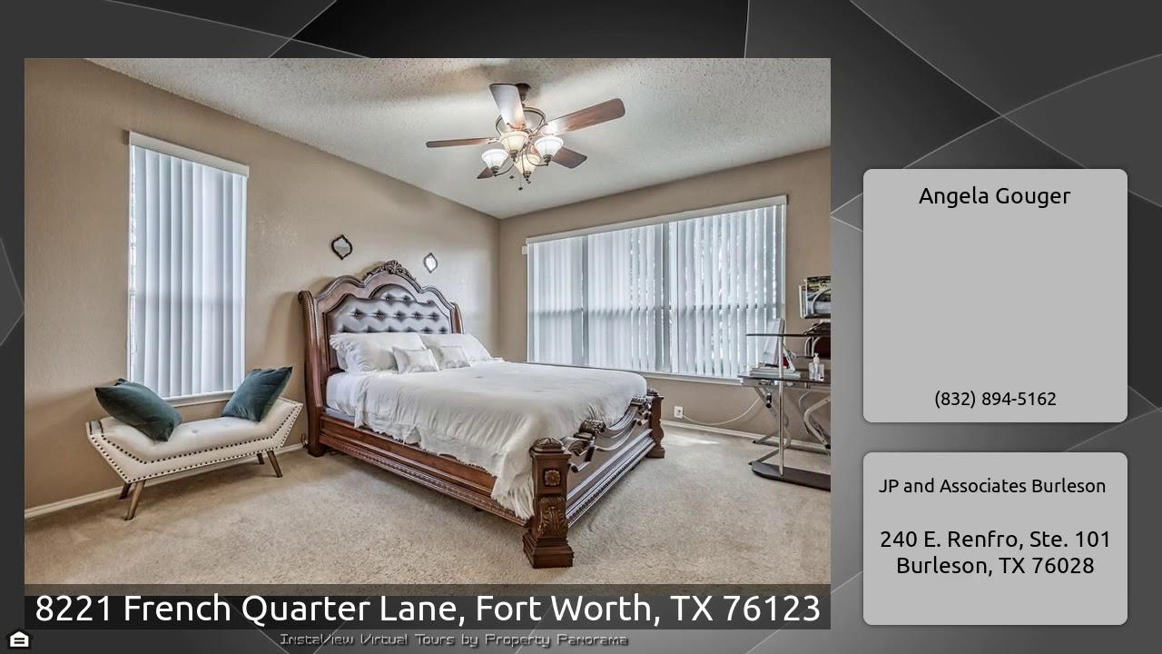 The Virtual Tour for the property at 8221 French Quarter Lane, Fort Worth, TX 76123 listed for $229,900: Other homes for sale by Angela Gouger of JP and Associates Burleson: Spacious two story brick home located on a quiet culdesac with easy access to shopping, schools and restaurants. This home boasts 4 bedrooms, 2.5 baths and an upstairs bonus living space. The master suite is located downstairs for privacy with double sinks, garden tub, seperate shower, and large walk-in closet. This home is perfect for hosting large family gatherings with it's huge formal dining room and eat-in kitchen …