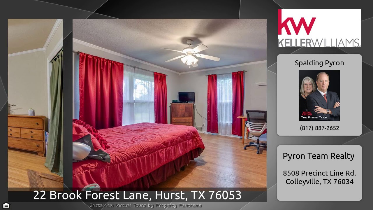 The Virtual Tour for the property at 22 Brook Forest Lane, Hurst, TX 76053 listed for $289,000: Other homes for sale by Spalding Pyron of Pyron Team Realty: Amazing property nestled on over a .8 Acre cul-de-sac lot offers 3 spacious bedrooms, 2 full baths, large kitchen with SS appliances, breakfast bar and a cozy breakfast nook, inviting formal dining with sitting area, french doors lead off of the dining into the family room & private office, master suite features a pedestal sink & separate shower along with retro tile. Beautiful hardwoods in living and bedrooms. Your private & serene …