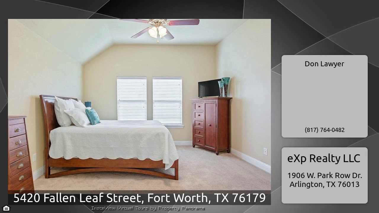 The Virtual Tour for the property at 5420 Fallen Leaf Street, Fort Worth, TX 76179 listed for $272,990: Other homes for sale by Don Lawyer of eXp Realty LLC: Beautiful one story home by exceptional builder, Impression Homes, with lovely views. No backyard neighbors! This one shows like a new home! Highly efficient home results in low energy bills. Walk to schools. Large covered patio is perfect for cool summer nights. Large entry with wood floors that leads to study featuring french doors, could be 4th bedroom. Kitchen, dining and living are all open for entertaining and tons of storage and …