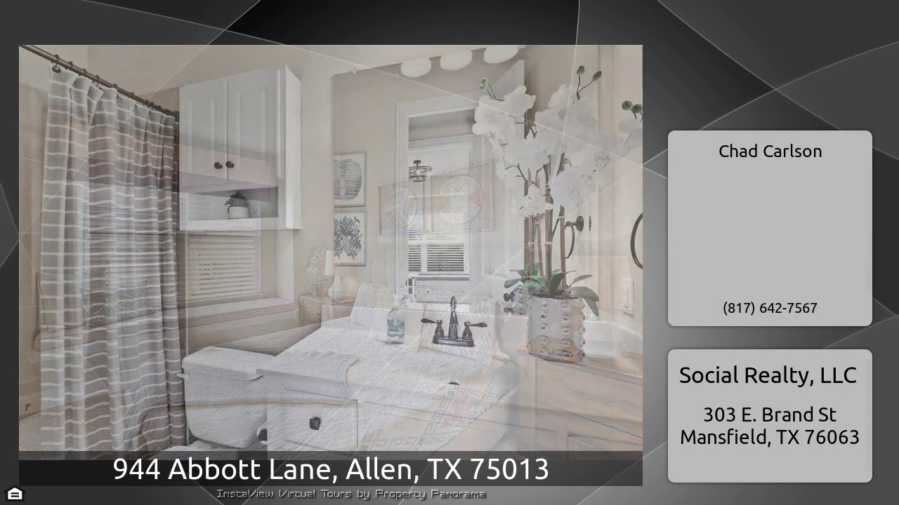 The Virtual Tour for the property at 944 Abbott Lane, Allen, TX 75013 listed for $659,000: Other homes for sale by Chad Carlson of Social Realty, LLC: Style and Elegance in this large 5 bedroom, 4 bath home in highly desired Allen ISD. As you enter you will find a spacious and bright open layout perfect for family living and entertainment. Formal dining with built-ins and study has beautiful french doors. Kitchen features huge island with seating overlooking the family room with floor to ceiling fireplace. Master suite has relaxing spa bath with large walk-in shower, dual vanities, …