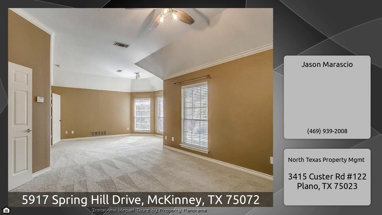 The Virtual Tour for the property at 5917 Spring Hill Drive, McKinney, TX 75072 listed for $2,450: Other homes for sale by Jason Marascio of North Texas Property Mgmt: Ready for immediate move in! One step inside this beautiful home will show the meticulous care that has been taken in maintaining! Soaring ceilings & french doors leading to the office with built-ins great you in the entry way. Large formal living & dining area leads to a spacious eat-in kitchen. The family room has a cozy fireplace & more built ins. The master suite has a dedicated reading or lounge area, along with a large …