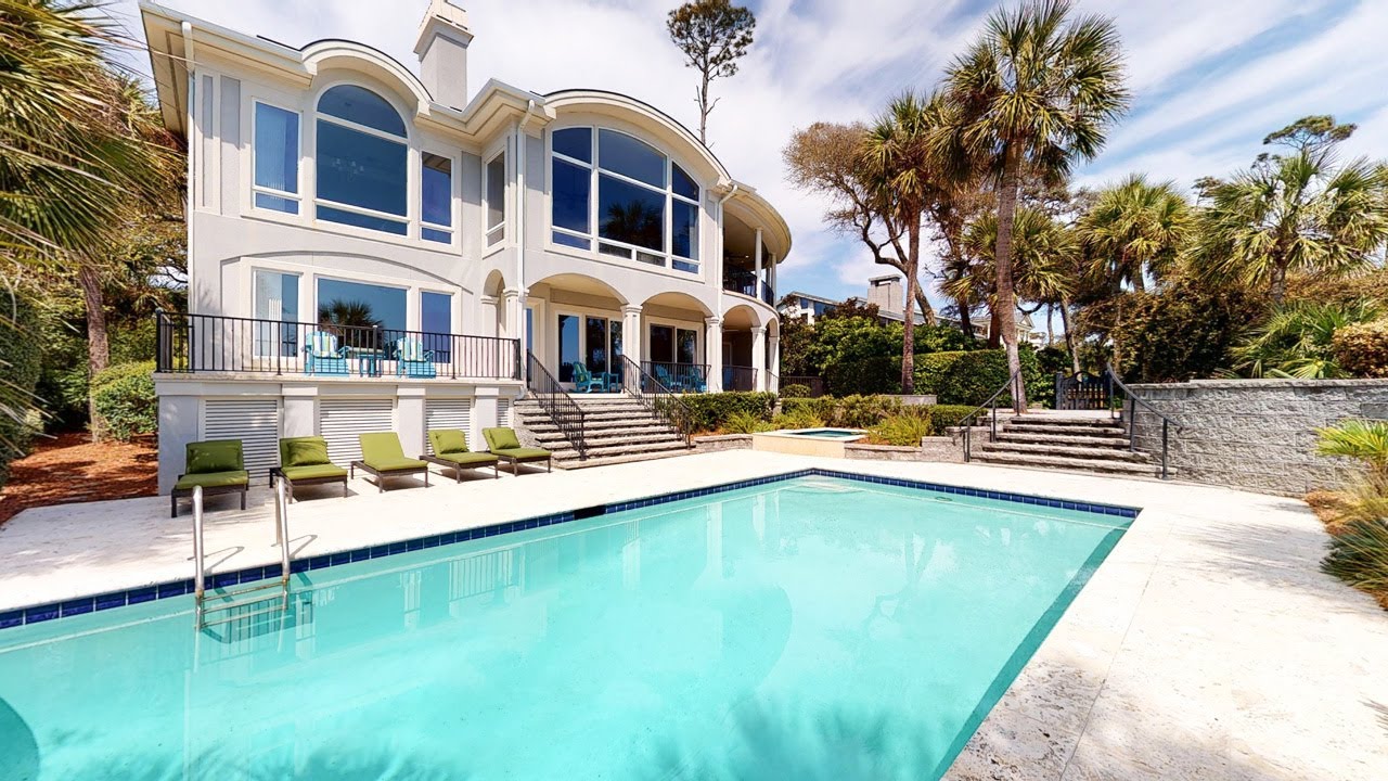 You’ll love this six bedroom oceanfront home located in prestigious Palmetto Dunes Oceanfront Resort. Boasting several large windows facing the oceanfront, this home provides oceanfront views from nearly every room! As you enter, you are first welcomed by a large foyer with travertine floors and a large wet bar which nearly doubles as a second kitchen. Just off this area is a small seating area where you can relax with drinks or tapas. Beyond this area is a second living area with a mounted HDTV that would be great for a kids entertaining area. Down the hallway, you will find three of the five guest bedrooms. The first guest bedroom features two twin beds and an en-suite bathroom with tiled tub and shower combination. The next guest bedroom has a king bed, french door access to the back porch, its own en-suite bathroom with tiled tub and shower combination and an HDTV. At the end of the hall is the second master suite. This large bedroom features a King bed, HDTV, french door access to the back patio and barbecuing area and, of course, a large en-suite bathroom. This bathroom consists of a large walk-in tiled shower, separate sunken tub and his and hers vanities. Going up just a few steps are two more guest bedrooms, one with two twin beds another with a King. Both of these bedrooms have en-suite bathrooms as well. Upstairs you’ll find the main kitchen, living and dining areas along with the expansive master suite. The formal dining area seats six and allows for beautiful ocean views while enjoying a family meal. A two-sided fireplace separates the dining area from the living room with its massive windows giving you panoramic ocean views from every seat! The gourmet kitchen features beautiful cabinetry, stainless steel appliances, granite countertops and a breakfast nook with seating for an additional six guests. Down the hall you’ll find the expansive master suite with its king bed, HDTV, enormous walk-in closet space and private balcony with a large dining and seating areas overlooking the Atlantic Ocean. The en-suite master bathroom completes this main floor with a large tiled walk-in shower, separate sunken tub and his and hers vanities. Outside you’ll have your very own private pool and spa complex. With its custom tiled pool deck you are treated to several suntanning, lounging and dining options – more than enough for the entire family! The ocean path beside the house takes you out the beach in ten seconds or less!