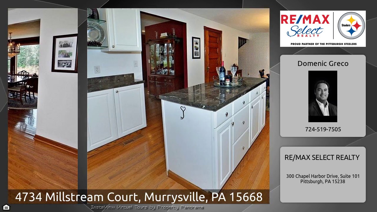 The Virtual Tour for the property at 4734 Millstream Court, Murrysville, PA 15668 listed for $389,900: Other homes for sale by Domenic Greco of RE/MAX SELECT REALTY: LOOK NO FURTHER THIS IS THE PERFECT HOME INSIDE & OUT FOR BOTH ENTERTAINING OR RELAXING WITH FRIENDS & FAMILY. THE SPACIOUS MAIN LEVEL FEATURES AN OPEN FLOOR PLAN WITH AN ENORMOUS GREAT ROOM, FORMAL DINING ROOM A LARGE EAT IN KITCHEN WITH CUSTOM MARBLE COUNTERTOPS, AN ISLAND & NEW STAINLESS STEEL APPLIANCES ALL WITH BEAUTIFUL HARDWOOD FLOORS & SOLID WOOD DOORS THRU-OUT. FRENCH DOORS LEAD YOU TO A LARGE REAR BRICK PATIO PERFECT FOR …
