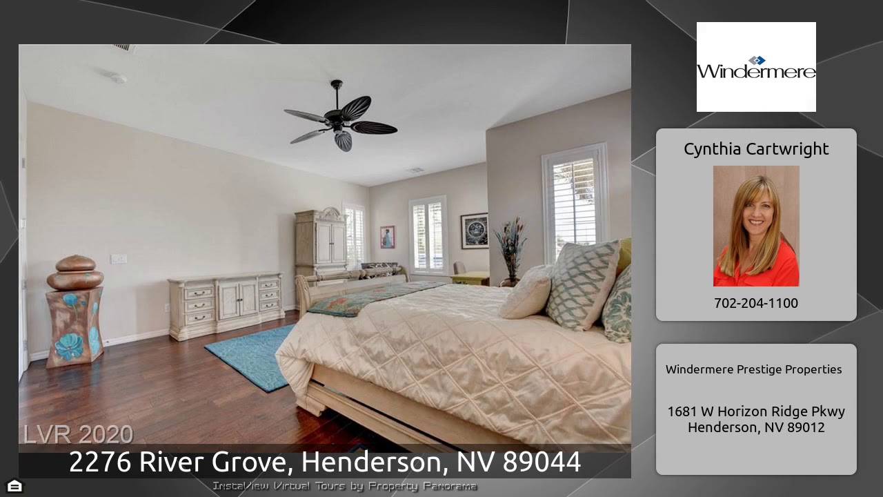 The Virtual Tour for the property at 2276 River Grove, Henderson, NV 89044 listed for $599,000: Other homes for sale by Cynthia Cartwright of Windermere Prestige Properties: Gorgeous Sun City Anthem Home features Lush, Custom Landscaping/Gated Courtyard/Covered Patio & Partially In-Ground Spa*Formal Living Room w/ Wet Bar*Formal Dining Room*Family Room w/ Fireplace*Island Kitchen w/ Granite Counters/Upgraded Cabinets & Stainless Appliances Master Suite w/ Sitting Area & Bath w/ 2 Sinks, Soaking Tub, Shower & Walk-in Closet*Mini-Master Suite w/ Private Bath*Den w/ French Doors*Partial City …