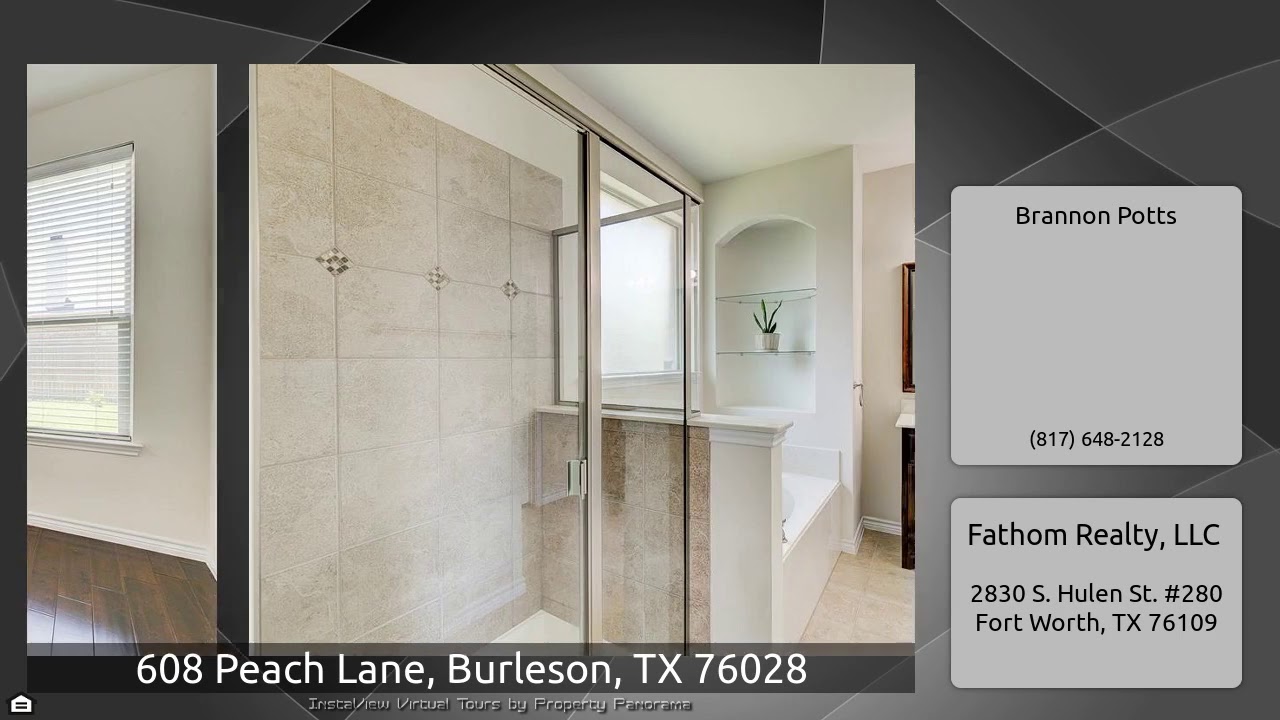 The Virtual Tour for the property at 608 Peach Lane, Burleson, TX 76028 listed for $252,000: Other homes for sale by Brannon Potts of Fathom Realty, LLC: Stunning, move in ready, Cheldan Home complete with crown molding, wood floors, high ceilings and gas fireplace. Frigidaire Gallery line stainless appliances in the kitchen with granite countertops, under cabinet lighting and tiled backsplash. Butlers pantry with storage between the laundry and kitchen. 2 sets of French doors lead into the formal dining or in home office. Split bedroom floor plan has two rooms with walk in closets and …
