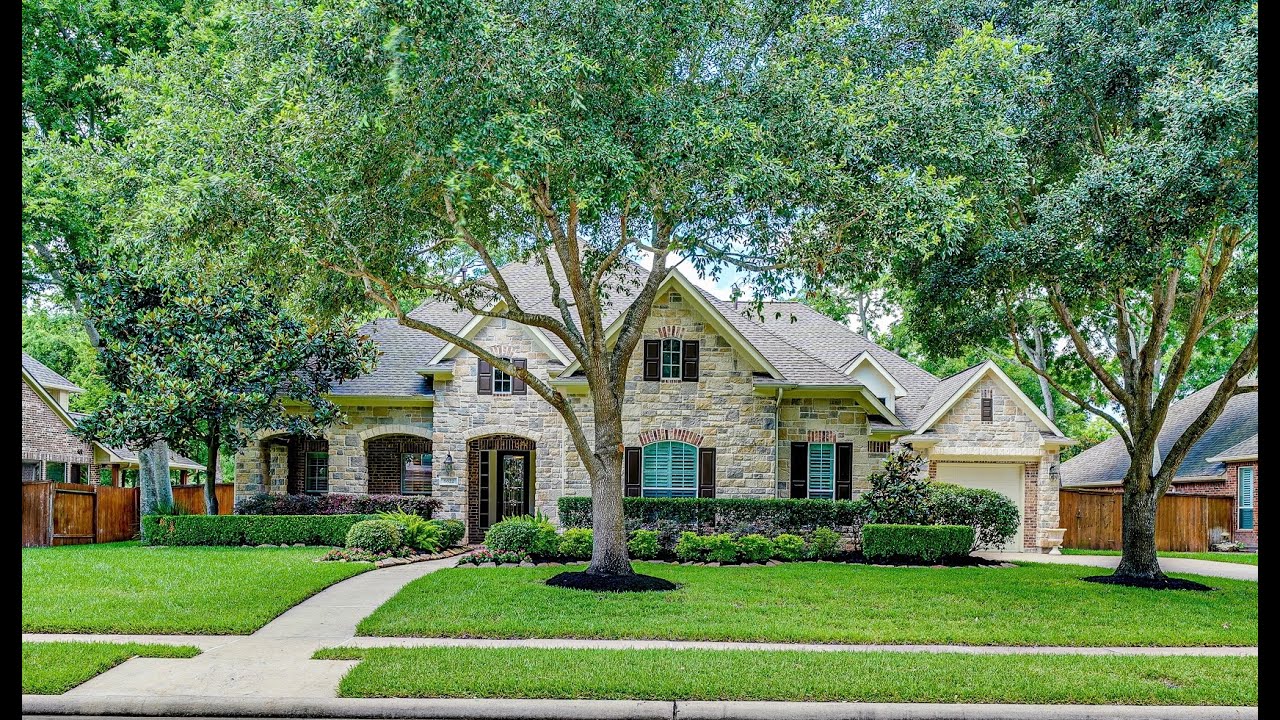 Gorgeous 1.5 story open floor plan situated on a wooded lot features beautiful landscaping with heated pool, new roof in 2018, plantation shutters and hardwood & ceramic tile floors throughout the living areas. Elegant foyer w/art niches & wine grotto leads to study w/French doors & dining room. Living room has windows overlooking the pool, cast stone gas log fireplace, built-in entertainment center and opens to island kitchen with breakfast bar, wood-stained cabinets, granite counters w/tiled back splash, S/S appliances including double ovens, refrigerator and butler’s pantry. Master suite has room for sitting area & master bath has dual sinks, whirlpool tub, shower w/seating & two walk-in closets. All bedrooms have en-suite baths & upstairs has a game room w/half bath, kitchenette w/sink, microwave, built-in ice machine & fridge and a fully equipped media room w/projector, screen & seating. Fabulous backyard with screened-in patio overlooks pool & fountains surrounded by decking.