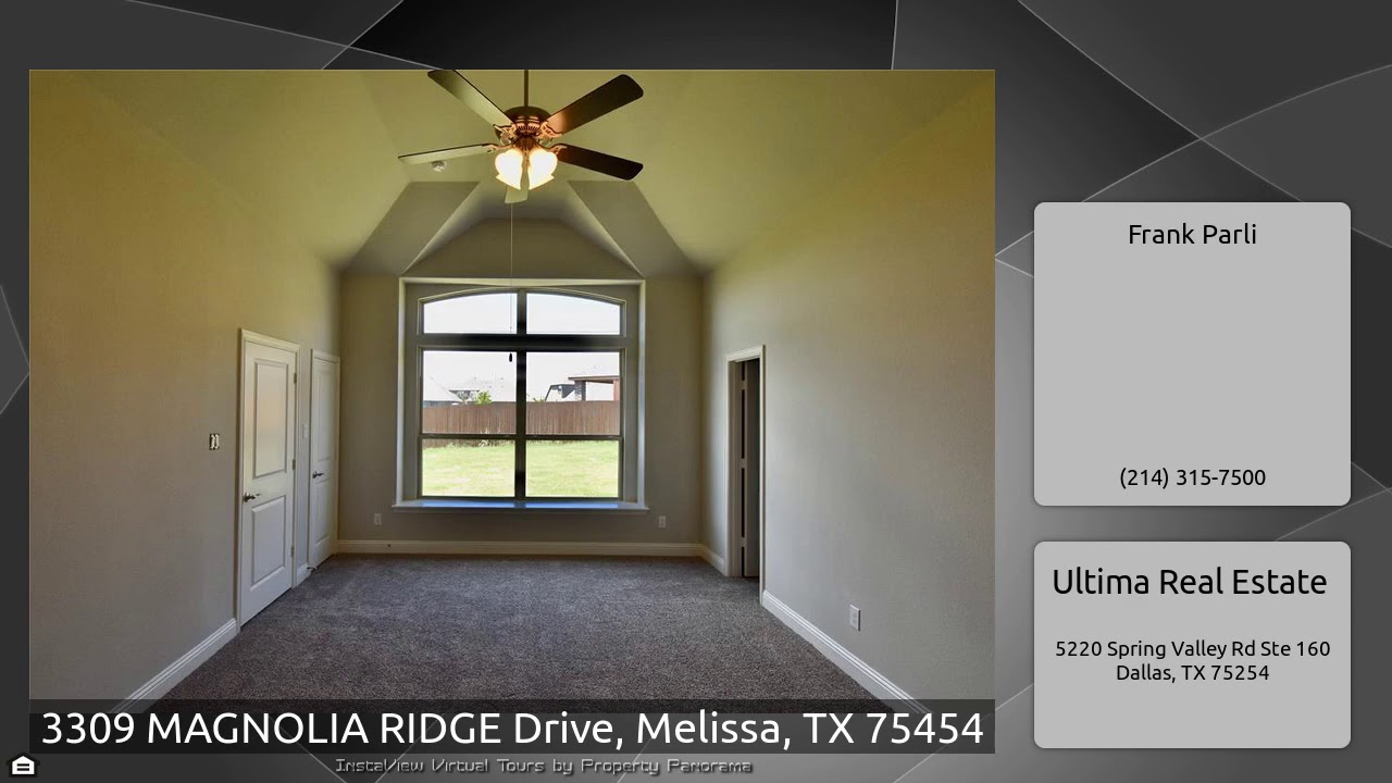 The Virtual Tour for the property at 3309 MAGNOLIA RIDGE Drive, Melissa, TX 75454 listed for $399,990: Other homes for sale by Frank Parli of Ultima Real Estate: BRAND NEW IN MAGNOLIA RIDGE! 3 CAR GARAGE Beautiful Country French design with stone accents. 8' Knotty Alder front door leads to soaring 2 story entry featuring Juliet Balcony overlook and hardwood floors. WOOD ALSO IN STUDY AND F. DINING! Study with French Doors, Large F. Dining. Huge Master Down. Large 2-story Family Room. Great Kitchen with Custom Cabinetry and Granite tops. Guest BR down, 3 bedrooms, Game, Media up. Upgraded …