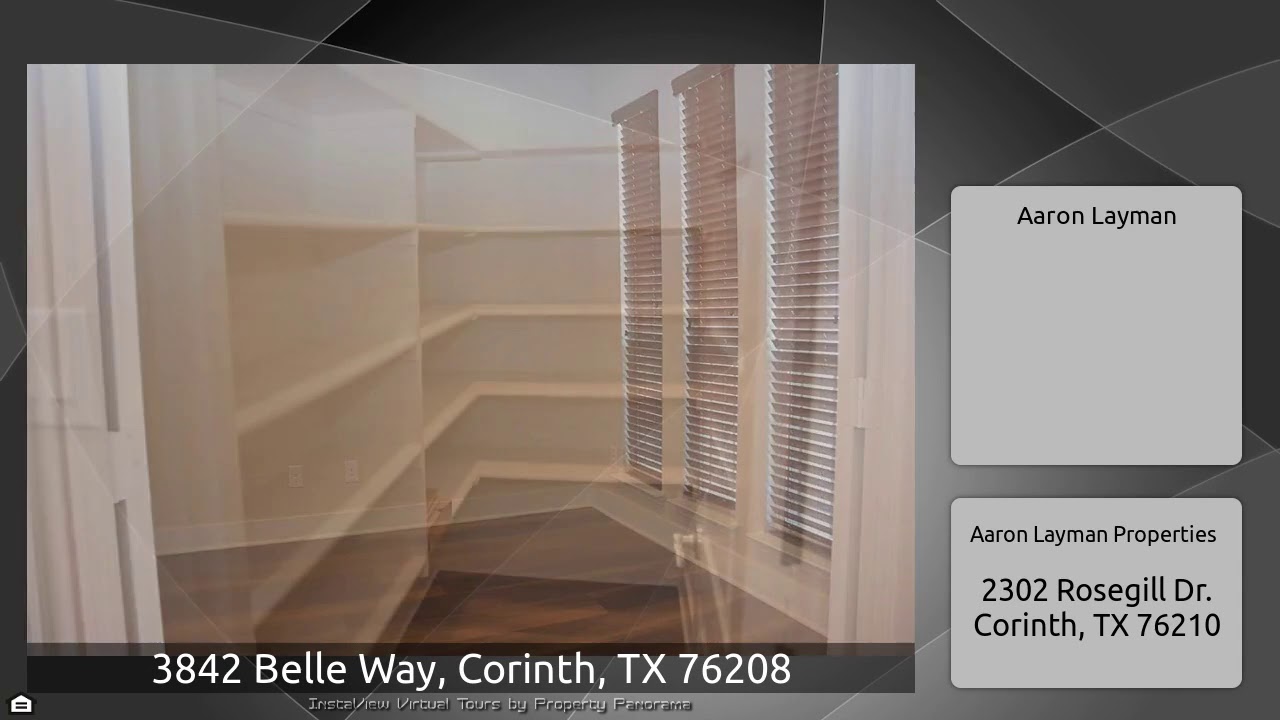 The Virtual Tour for the property at 3842 Belle Way, Corinth, TX 76208 listed for $435,000: Other homes for sale by Aaron Layman of Aaron Layman Properties: Barely lived in gem. Still has that new home smell. Wood-look flooring throughout common areas. Fabulous gourmet kitchen with Shaker cabinets, Shaker wood hood, pull-out drawers, double ovens, 6 burner cook top, & natural stone counter tops, and a large walk-in pantry. Large living area with a stone fireplace. Private study with double French doors. Large formal dining area. Huge master bedroom with private master bath and a walk-in …