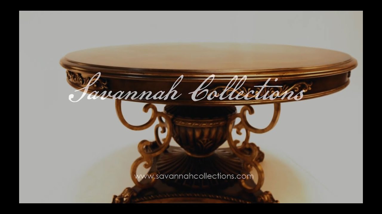 Newhaven Dining Table available in Parisian Bronze finish. Elegant, circular table with an intricately carved base from solid mahogany wood. Majestic and refined, this is a table that will last for generations.