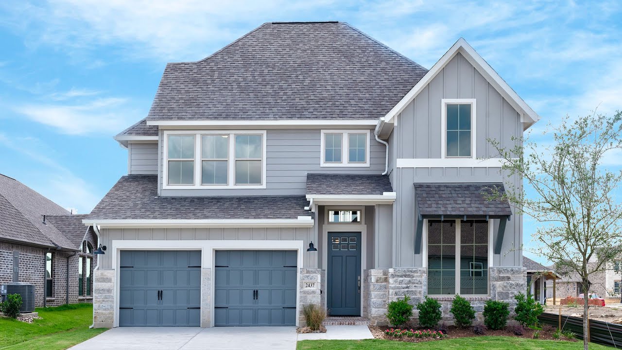 Pecan Square will be reminiscent of a classic Texas town full of life, town spirit and new ways to live. This 2694 sq. ft. plan offers four bedrooms and three full bathrooms. Library with glass French doors set at two-story entry. Open kitchen offers deep walk-in pantry and inviting island with built-in seating space. Two-story dining area flows into two-story family room with ceramic tile floor, wall of windows and wood mantel fireplace. First-floor master suite includes bedroom with 10-foot ceiling. Double doors lead to master bath with dual vanities, garden tub, separate glass-enclosed shower and large walk-in closet. An additional bedroom is downstairs. A game room and two secondary bedrooms are upstairs. Abundant closet space and natural light throughout. Covered backyard patio. Utility room leads to two-car garage. #perryhomes #perryhomesdallas #pecansquare