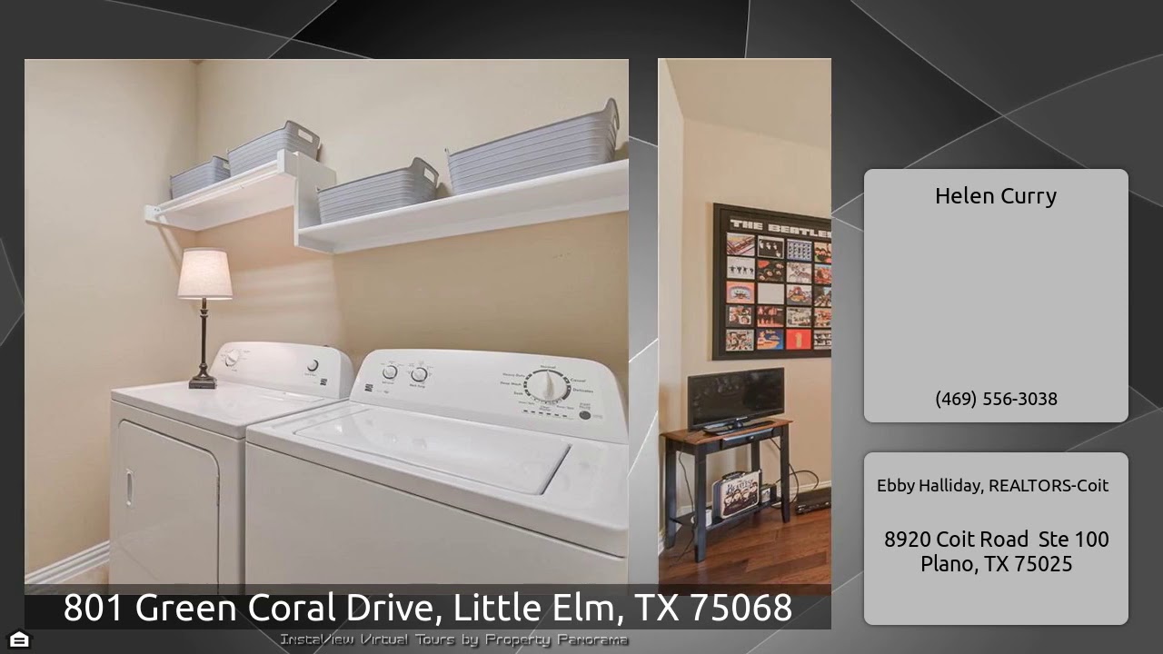 The Virtual Tour for the property at 801 Green Coral Drive, Little Elm, TX 75068 listed for $265,000: Other homes for sale by Helen Curry of Ebby Halliday, REALTORS-Coit: Well maintained 1 Story Home with 4 Bedrooms PLUS Study & Spacious Family Room. Landscaped yard w stone lined flower beds. Covered Front Porch opens to foyer w wood flooring extending thru formal dining, study & hallway. Study w French Doors. Formal Dining Room for entertaining. Spacious Kitchen reveals abundance of Granite Countertops, Island, Breakfast Bar. Stainless Steel Appliances. Charming Breakfast Room off Kitchen. …