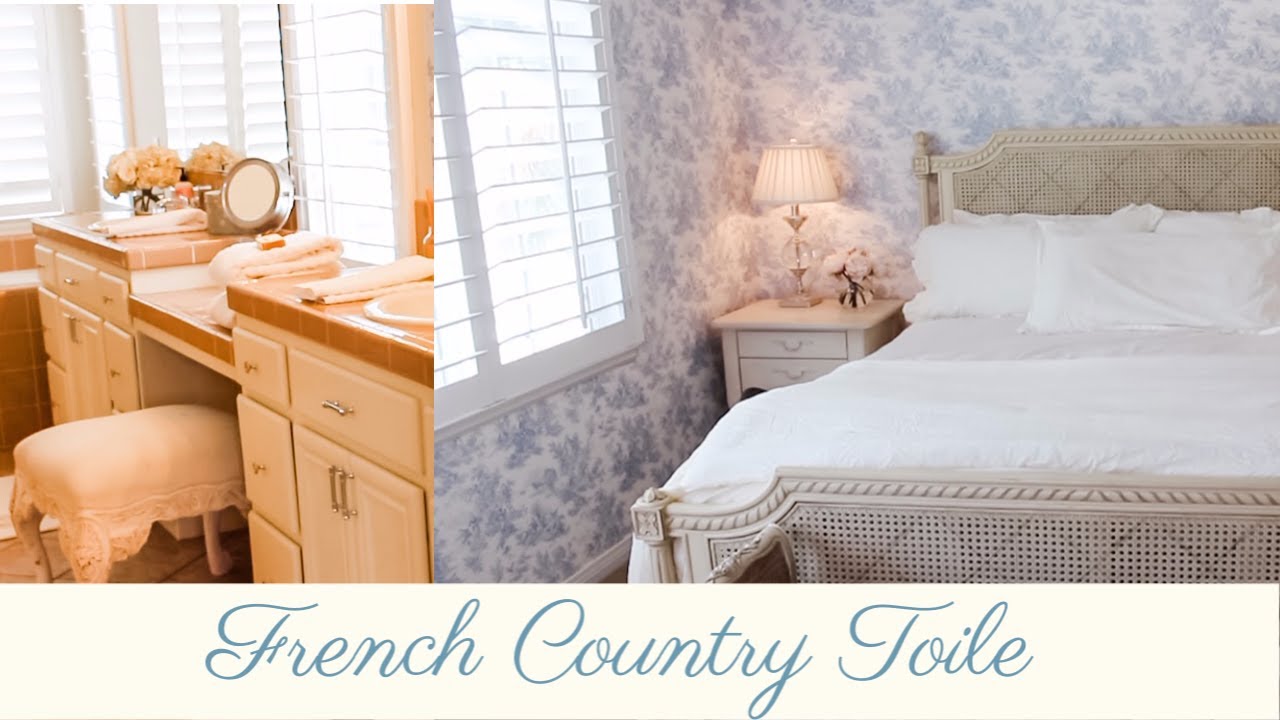 We redecorated our master bedroom and bathroom on a budget and have the dramatic results to share with you today. We had our bedroom wallpapered with blue toile wallpaper. In our master bathroom, we had the cabinets and walls painted, added handles, and changed the lighting fixture. You will not believe the stunning transformation. All of this was achieved on a small budget. Thank you for watching our French Country Master bedroom transformation. ~Jennifer and Ben