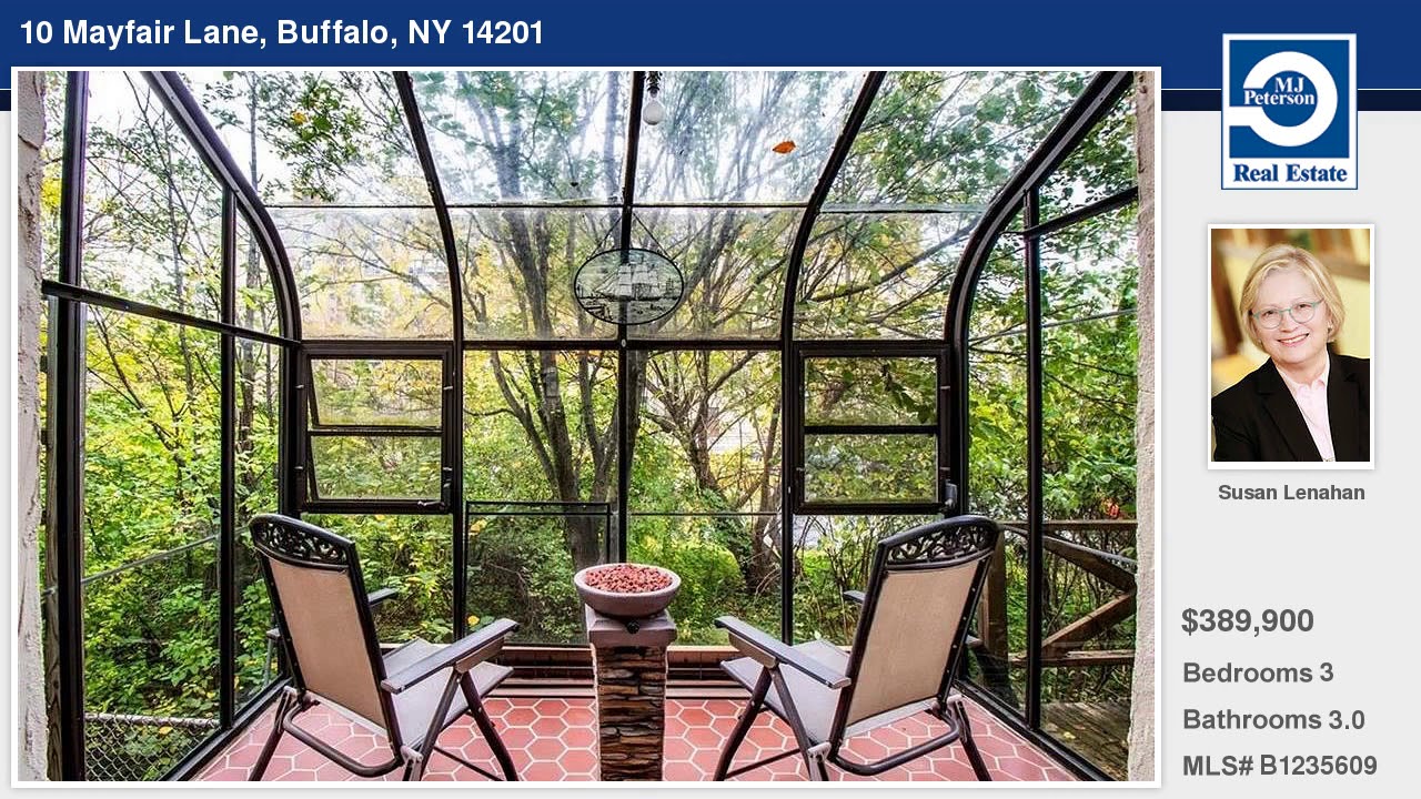 10 Mayfair Lane Buffalo New York Homes for Sale | www.mjpeterson.com | Susan Lenahan with MJ Peterson Real Estate | See full property details at | Welcome to the Charming Mayfair Lane. This unique townhome complex, steps away from Allentown features 3 bedrooms and 3 full baths. Gleaming hardwood floors throughout, the living room features built-ins and a gas fireplace. Formal dining room with French doors that lead to the enclosed porch and outdoor deck. Kitchen with granite countertops and recessed lighting. The master bedroom with en-suite bath, hardwood floors and sitting area. The additional bedrooms feature en-suite bathrooms. Finished third floor. Utility room on lower level with laundry and attached one car garage. Charming home with a great location! Also listed as a town home under MLS number B1235628.