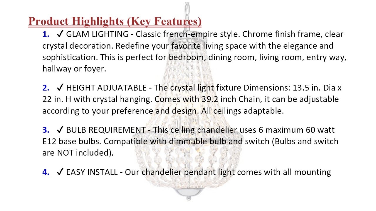 1. ✔ GLAM LIGHTING – Classic french-empire style. Chrome finish frame, clear crystal decoration. Redefine your favorite living space with the elegance and sophistication. This is perfect for bedroom, dining room, living room, entry way, hallway or foyer.