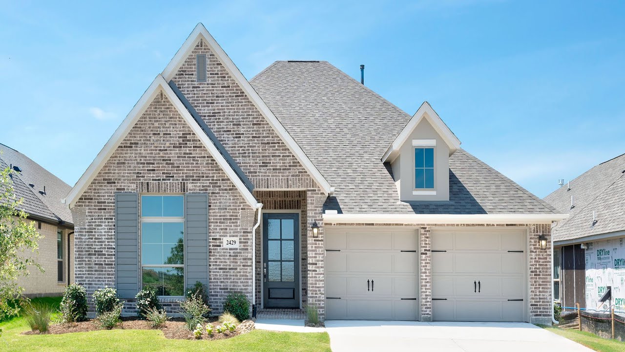 Pecan Square will be reminiscent of a classic Texas town full of life, town spirit and new ways to live. This 2352 sq. ft. plan offers four bedrooms and three full bathrooms. Entry with 12-foot ceiling leads to open family room, dining area and kitchen. Ceramic tile floors throughout. Family room features wood mantel fireplace. Kitchen features generous island with built-in seating space. Master suite includes bedroom with wall of windows. Dual vanities, corner garden tub, separate glass-enclosed shower and large walk-in closet in master bath. Library with French doors set at back entrance. Secondary bedrooms, a full bath plus a guest suite complete this open one-story design. Covered backyard patio. Two-car garage. #perryhomes