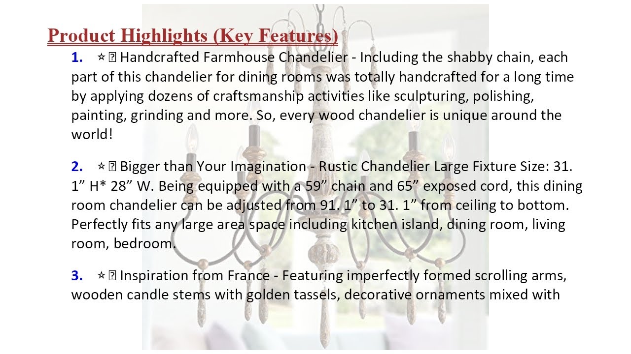 1. ⭐️ Handcrafted Farmhouse Chandelier – Including the shabby chain, each part of this chandelier for dining rooms was totally handcrafted for a long time by applying dozens of craftsmanship activities like sculpturing, polishing, painting, grinding and more. So, every wood chandelier is unique around the world!