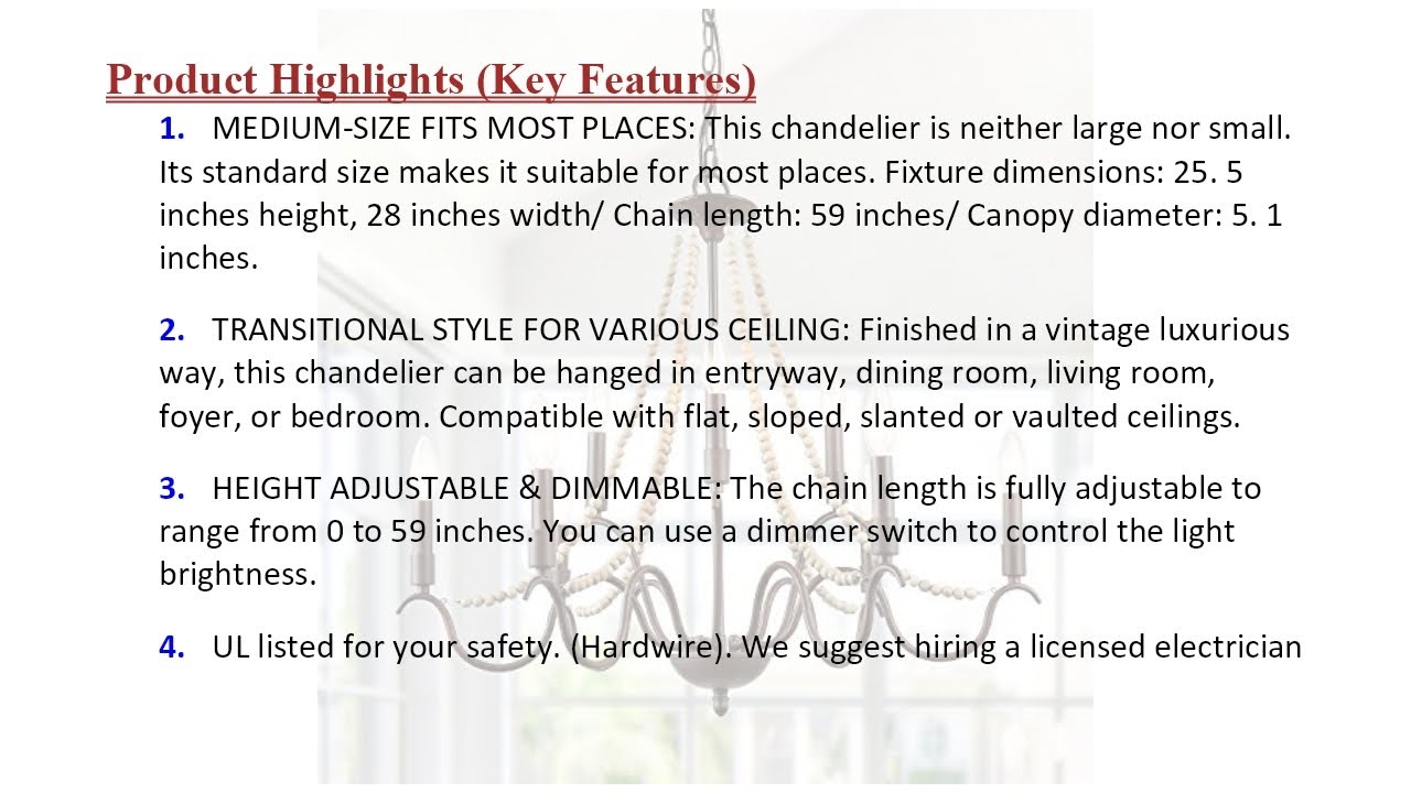 2. TRANSITIONAL STYLE FOR VARIOUS CEILING: Finished in a vintage luxurious way, this chandelier can be hanged in entryway, dining room, living room, foyer, or bedroom. Compatible with flat, sloped, slanted or vaulted ceilings.