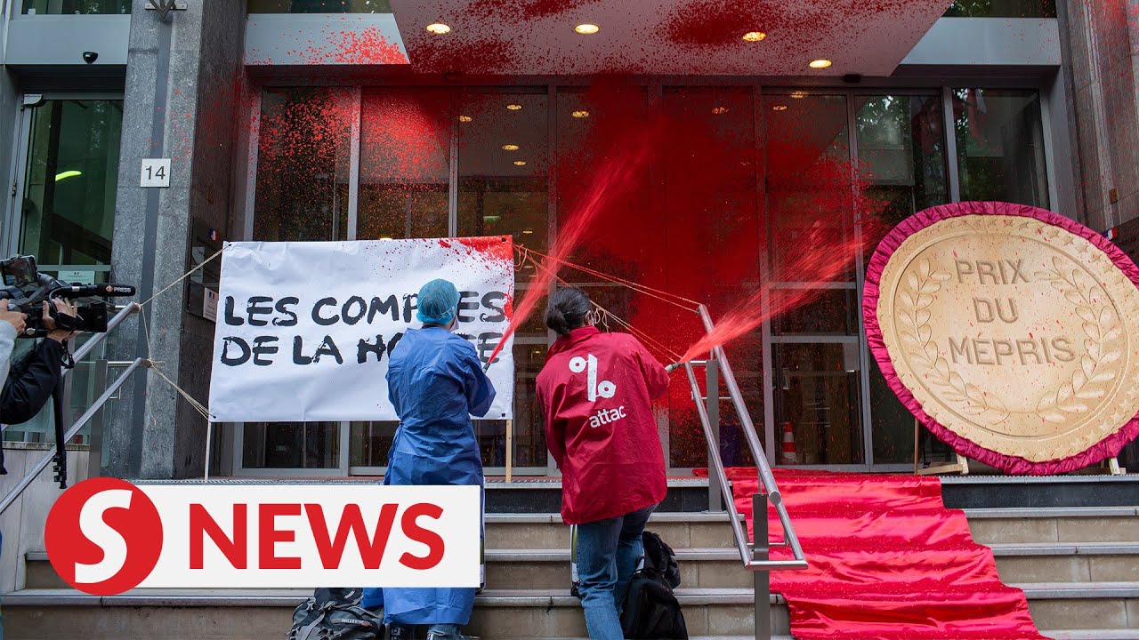 French protesters on Saturday doused the health ministry building with red paint to symbolise the blood of those who died from Covid-19.