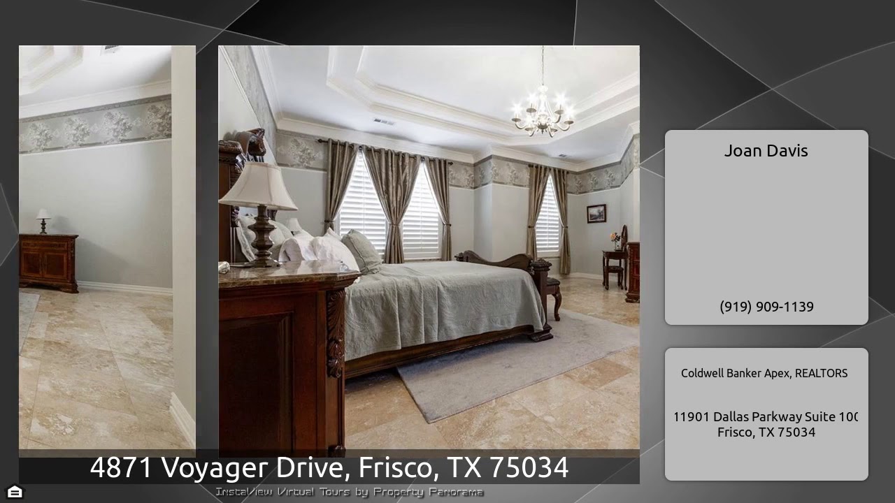 The Virtual Tour for the property at 4871 Voyager Drive, Frisco, TX 75034 listed for $539,000: Other homes for sale by Joan Davis of Coldwell Banker Apex, REALTORS: Delightful French Country – perfect home for the holidays! Great entertainment areas! Stunning staircase perfect for holiday photos and showcasing seasonal decorations. Formal dining for holiday meals, bake treats in your open concept kitchen while watching the big game in the adjoining great room, and enjoy an amazing backyard w stone fireplace, television and built in grill. Game room and theater room up — wonderful flex …