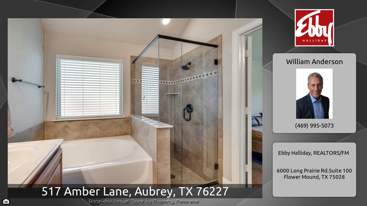 The Virtual Tour for the property at 517 Amber Lane, Aubrey, TX 76227 listed for $300,000: Other homes for sale by William Anderson of Ebby Halliday, REALTORS/FM: Bloomfield built home with hand scraped Hardwood floors in living kitchen and study. Enter home to find a study with french doors, open kitchen dining area & living. Kitchen has granite breakfast bar-island. Dining area has builtins and is open to the living room withe view of the backyard & stone WD fire place. Master bedroom has a window seat and attached master bath with walkin closet, double sinks, separate shower and garden …