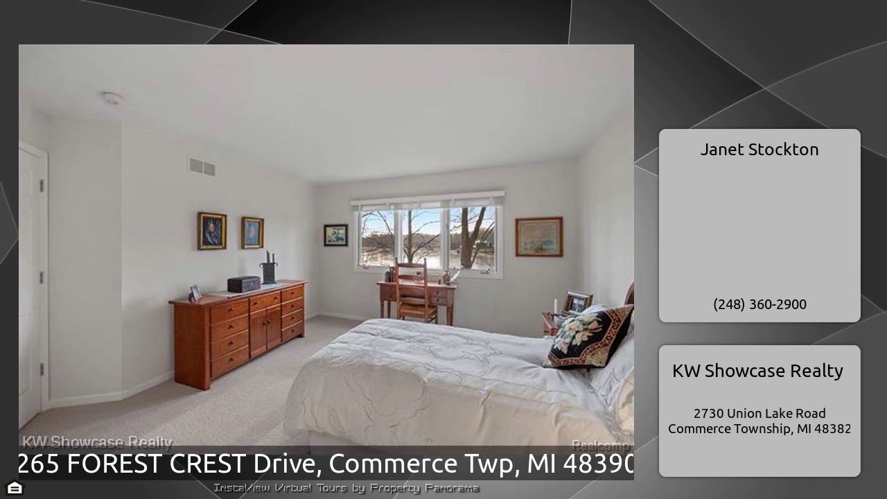 The Virtual Tour for the property at 265 FOREST CREST Drive, Commerce Twp, MI 48390 listed for $674,900: Other homes for sale by Janet Stockton of KW Showcase Realty: ABSOLUTELY GORGEOUS LAKEFRONT HOME OFFERS OVER 5,900 SF OF LIVING SPACE, FIRST FLOOR MASTER SUITE, FINISHED WALK-OUT AND A BEAUTIFULLY LANDSCAPED LOT WITH 160' OF SHORELINE ON WOODBRIDGE LAKE! Open plan features 2 story Foyer with 2nd story overlook, stunning 2 story Great Room w/fireplace & French doors leading to the deck, Dining w/hardwood floor, French door Library w/cathedral ceiling & hardwood floor. Large Kitchen …