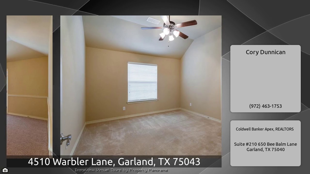 The Virtual Tour for the property at 4510 Warbler Lane, Garland, TX 75043 listed for $359,900: Other homes for sale by Cory Dunnican of Coldwell Banker Apex, REALTORS: The one you've been waiting for! Stunning home inside & out! Gorgeous entry with gleaming hardwoods, a home office with stained French Doors & moldings, a spacious formal dining with extensive moldings opening to butler's pantry & huge walk-in pantry. Family room showcases a stone fireplace, wall mounted flat screen & opens to casual dining area & breakfast bar. Kitchen boasts granite countertops, stainless appliances, & …