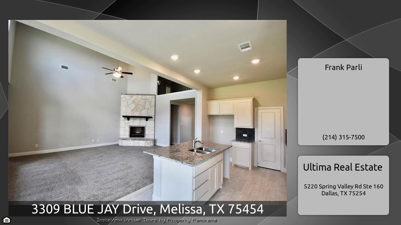 The Virtual Tour for the property at 3309 BLUE JAY Drive, Melissa, TX 75454 listed for $399,990: Other homes for sale by Frank Parli of Ultima Real Estate: BRAND NEW IN MAGNOLIA RIDGE! 3 CAR GARAGE Beautiful Country French design with stone accents. 8' Knotty Alder front door leads to soaring 2 story entry featuring Juliet Balcony overlook and hardwood floors. WOOD ALSO IN STUDY AND F. DINING! Study with French Doors, Large F. Dining. Huge Master Down. Large 2-story Family Room. Great Kitchen with Custom Cabinetry and Granite tops. Guest BR down, 3 bedrooms, Game, Media up. Upgraded …