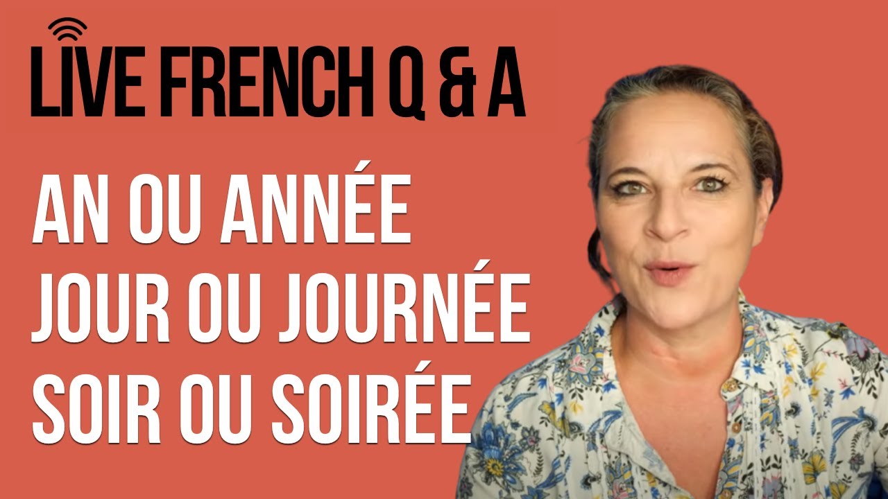 A live French Q&A session with Alexa where, among other things, she reviews the difference between AN and ANNÉE, JOUR vs JOURNÉE, SOIR vs SOIRÉE and explains . All the topics covered are listed in the VIDEO TIMESTAMPS section below. Visit for my full French Course. Merci et bisou bisou xx